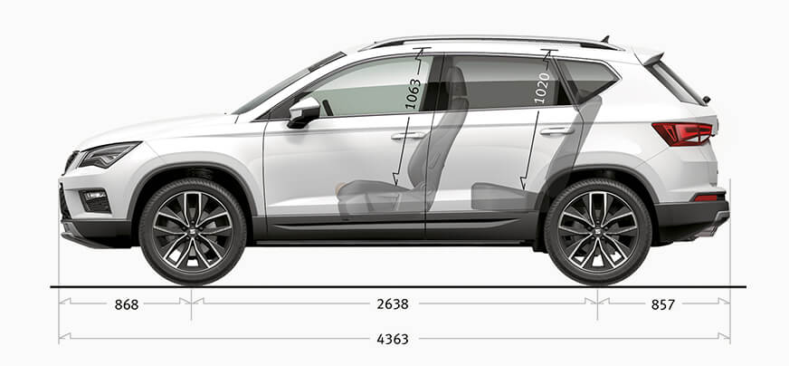 R-EPS Rack Electric Power System Turning diameter m. Safety Reference Style Xcellence FR Driver and passenger airbags with passenger airbag deactivation Side airbag in the front seats Seat belt reminder electric contact in buckle Child seat anchor for child seat system iSOFiX Electronic Stabilization Programme ESP. In keeping with SEATs tradition of naming its cars after Spanish places The Ateca is named after Ateca village. Dimensions of new SEAT cars with pictures to compare the measurements of length width and height of each model.